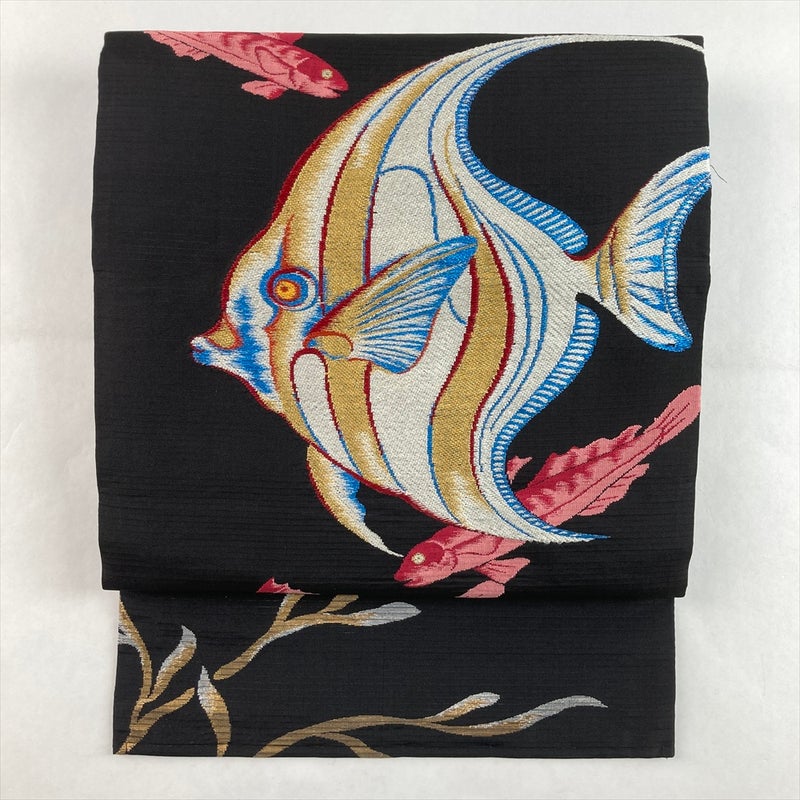 黒地にエンゼルフィッシュなどの魚文様が印象的な、ヴィンテージ夏名古屋帯。