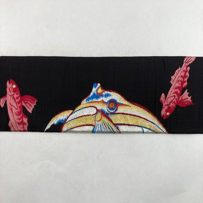 (中古)夏名古屋帯 黒 ヴィンテージ 名古屋仕立て 織り 魚 海 絹 未洗い