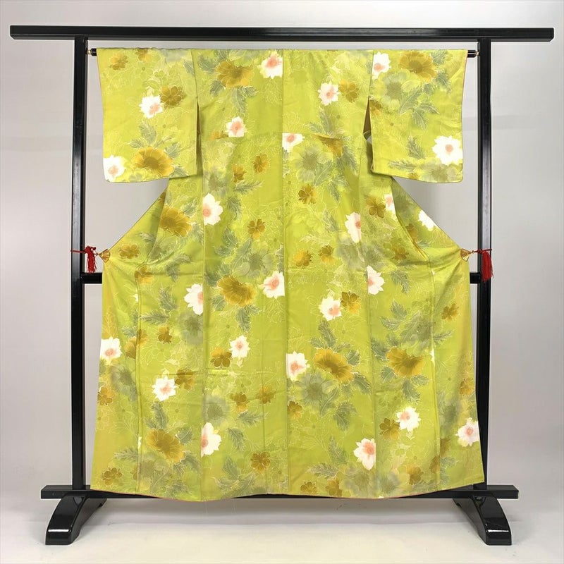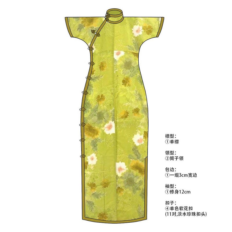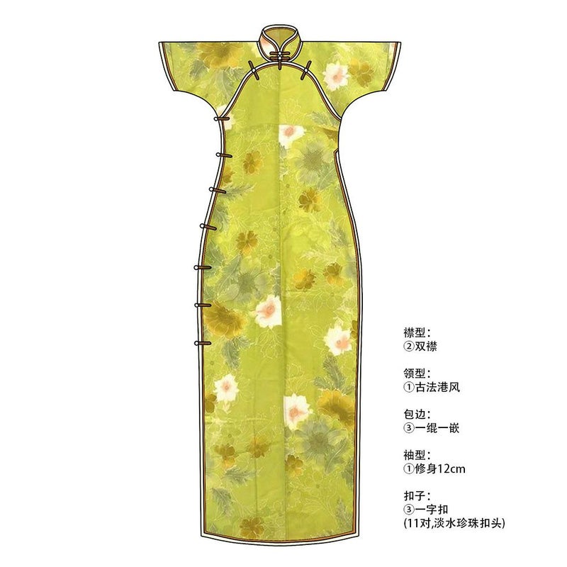 古法旗袍定制 小纹 正绢黄绿色 金彩织物 花朵和草花图案 チャイナドレス 仕立て オーダーメイド