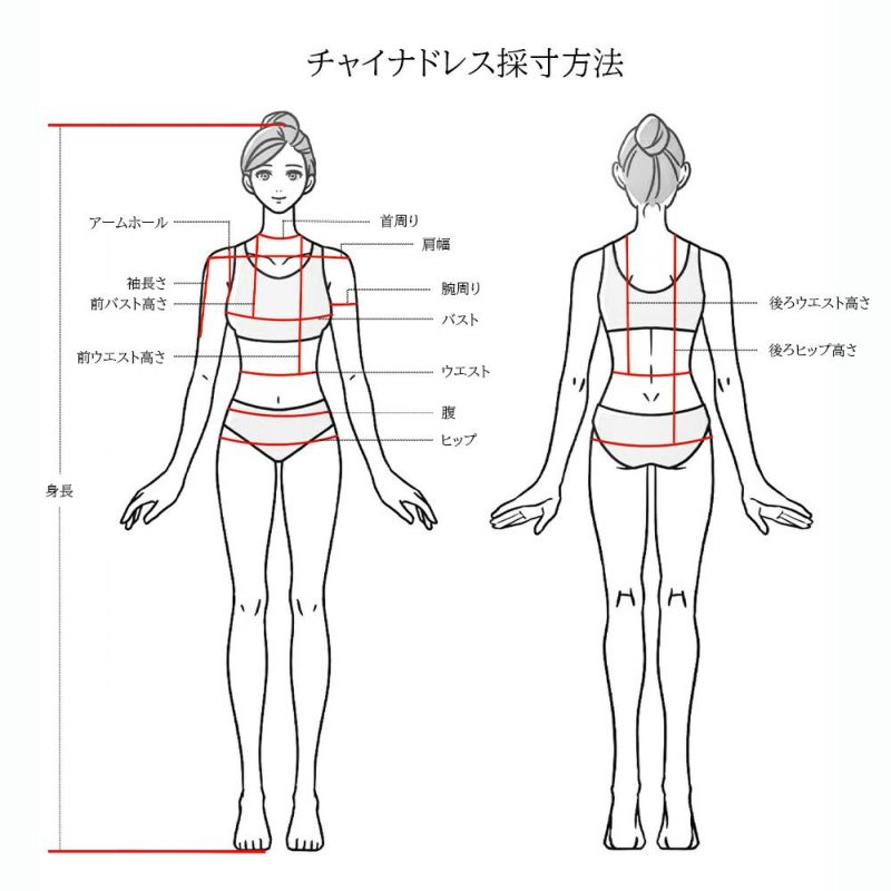 チャイナドレスの詳細採寸方法はWeChatIDまでお問い合わせください。