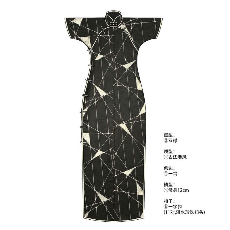 古法旗袍定制 小纹 黑色 暗纹 几何图形 四季花图案 チャイナドレス 仕立て オーダーメイド