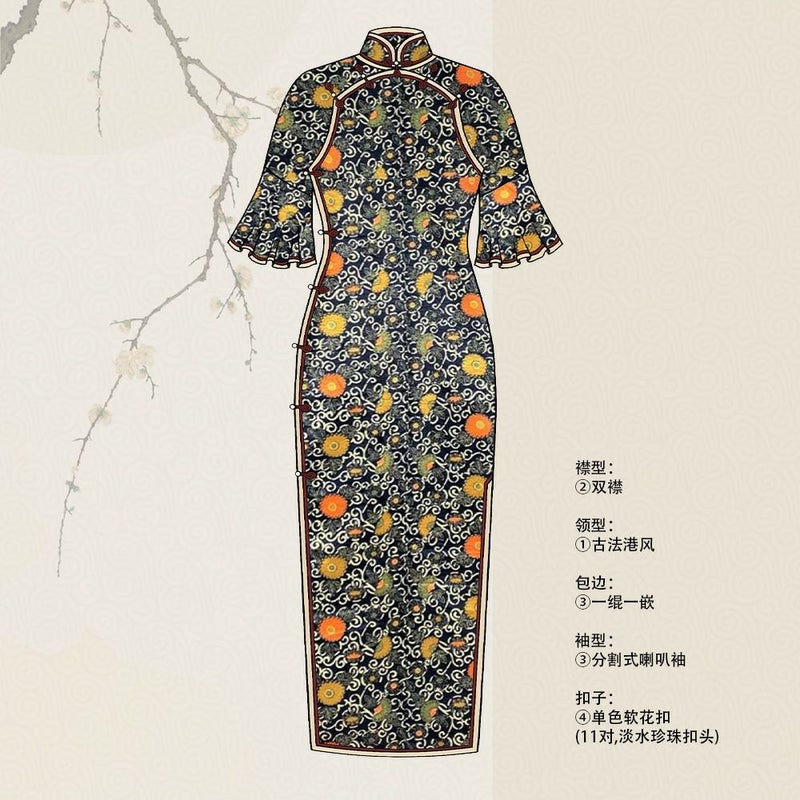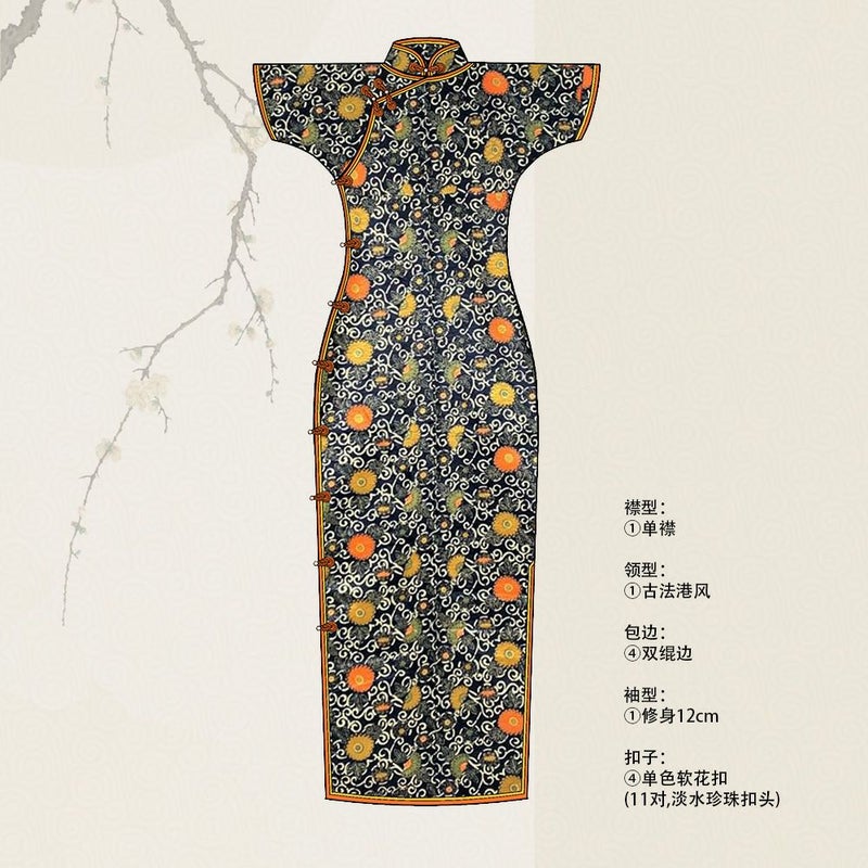 古法旗袍定制 小纹 藏蓝色 常春藤和花朵图案 暗纹织 チャイナドレス 仕立て オーダーメイド