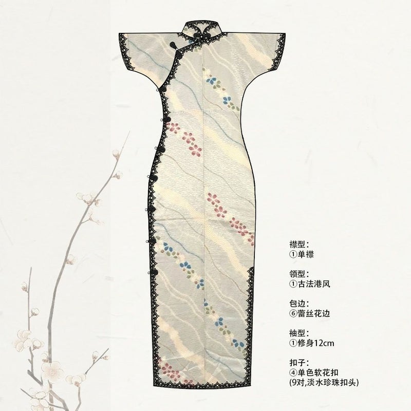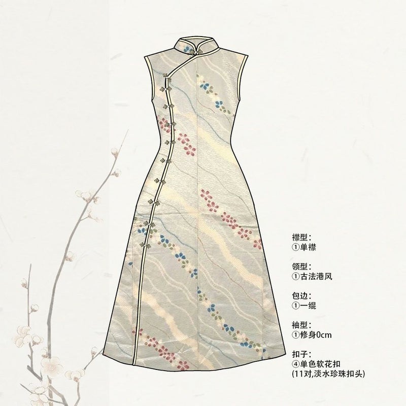 古法旗袍定制 小纹 浅灰蓝色 扎染花卉弯曲条纹 暗纹 チャイナドレス 仕立て オーダーメイド