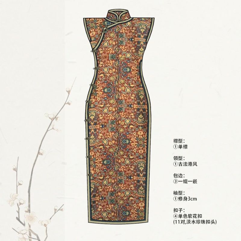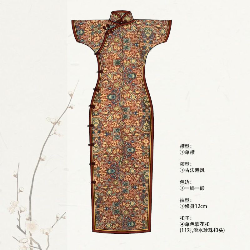 古法旗袍定制 小纹 茶色 草花鸟鹿图案 壁画风格 チャイナドレス 仕立て オーダーメイド