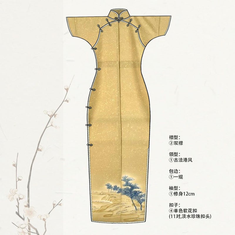 古法旗袍定制 访问着 姜黄色 风景图案 チャイナドレス オーダーメイド 仕立て