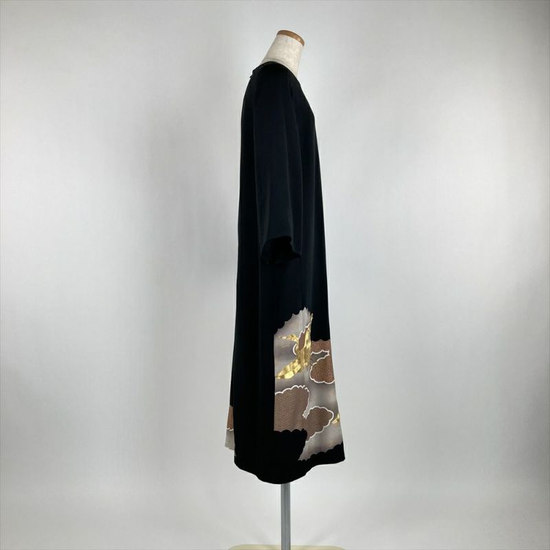 (リメイク) ワンピース 黒色 カジュアル 刺繍 金彩 鶴 雲
