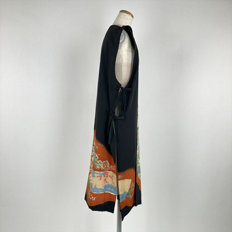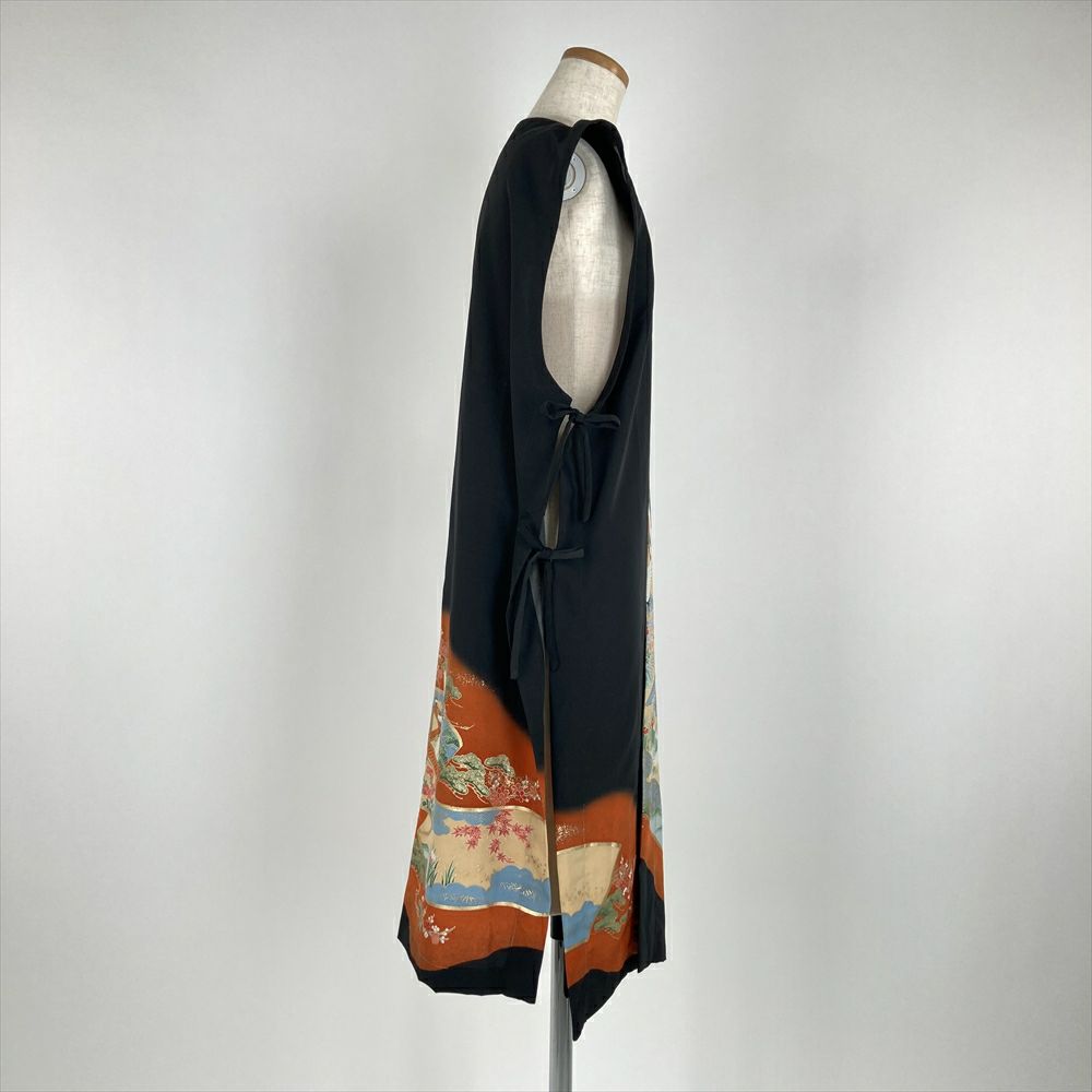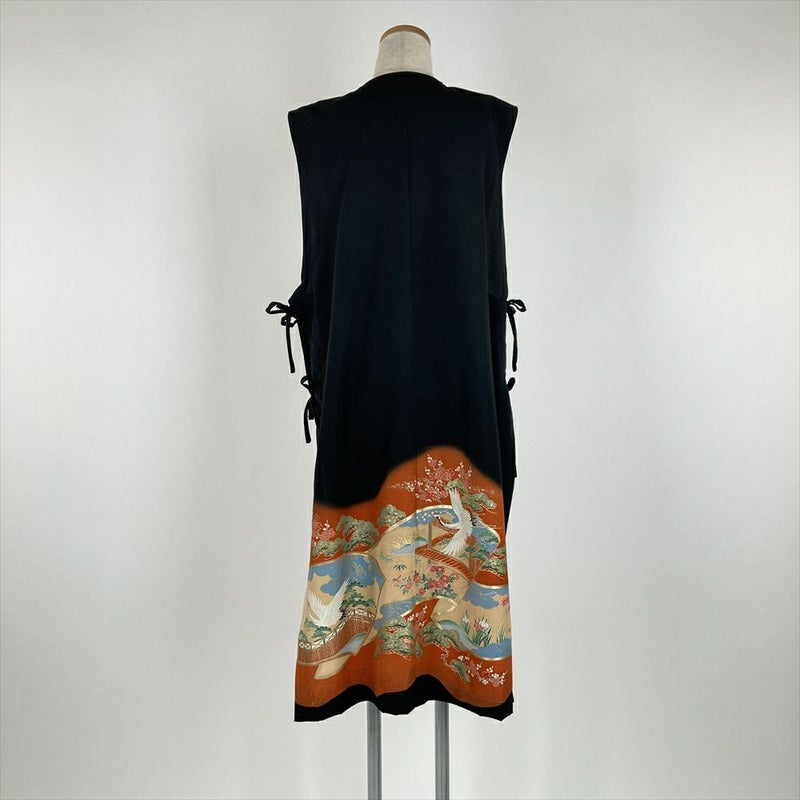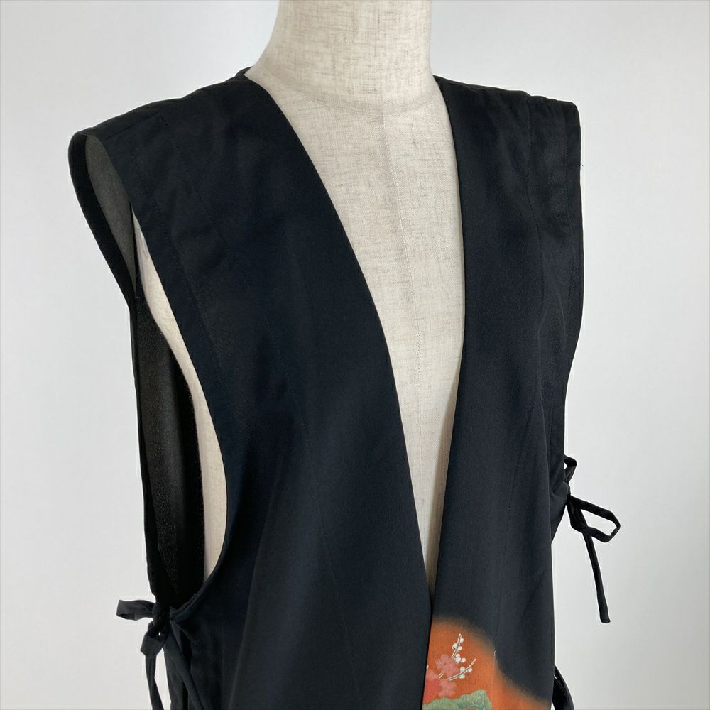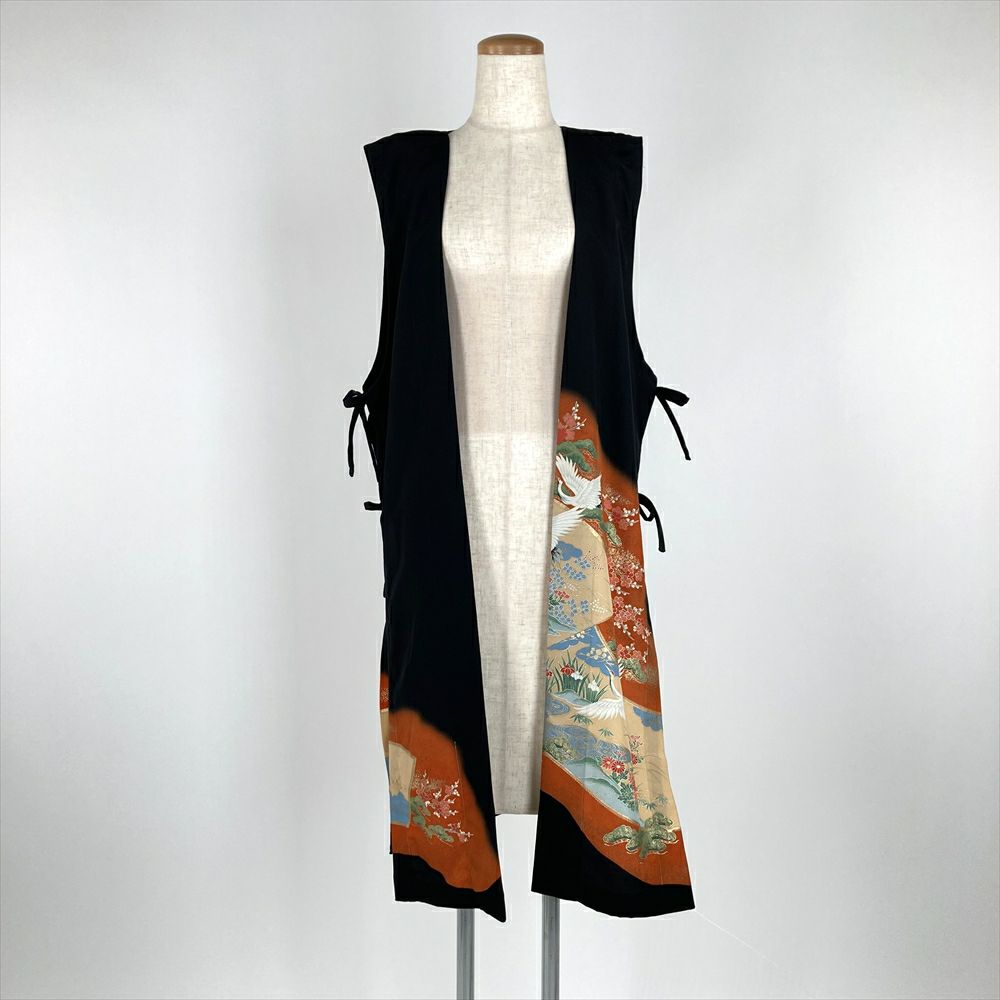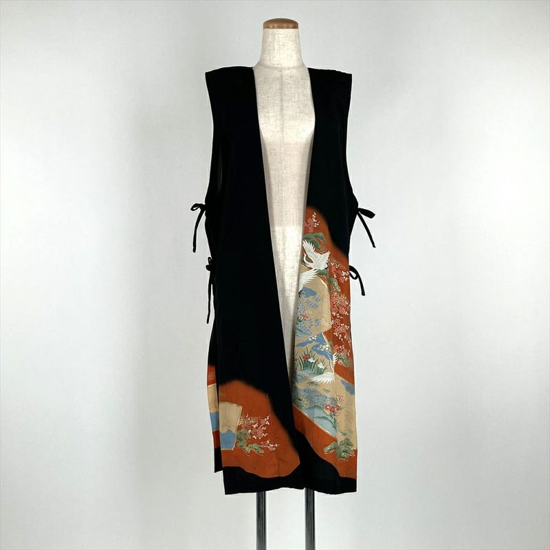 (リメイク) ロングベスト 黒色 カジュアル 金彩 花鳥 絵巻 ジレ