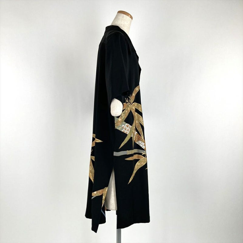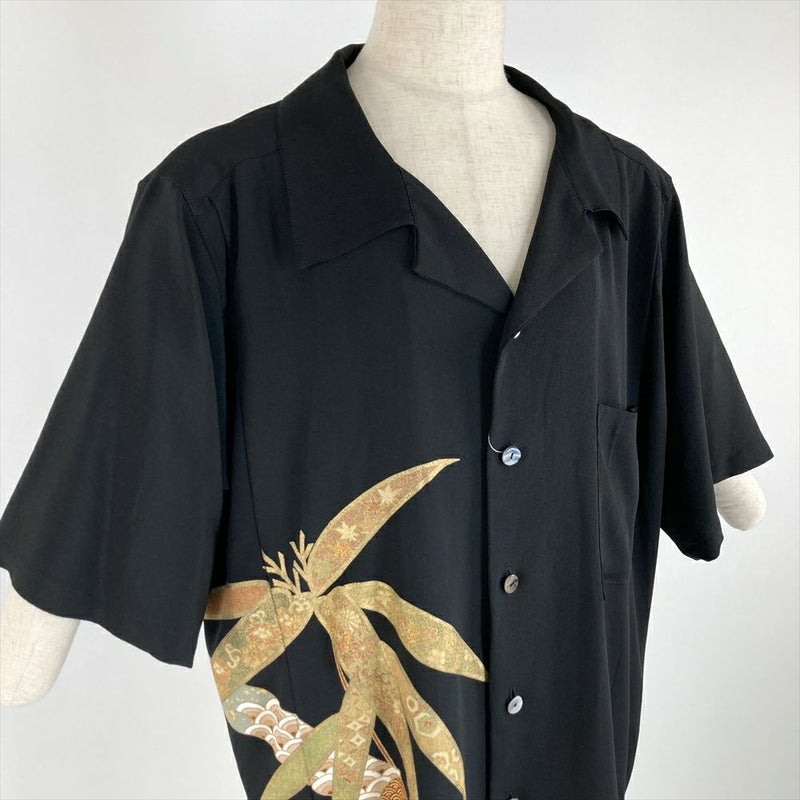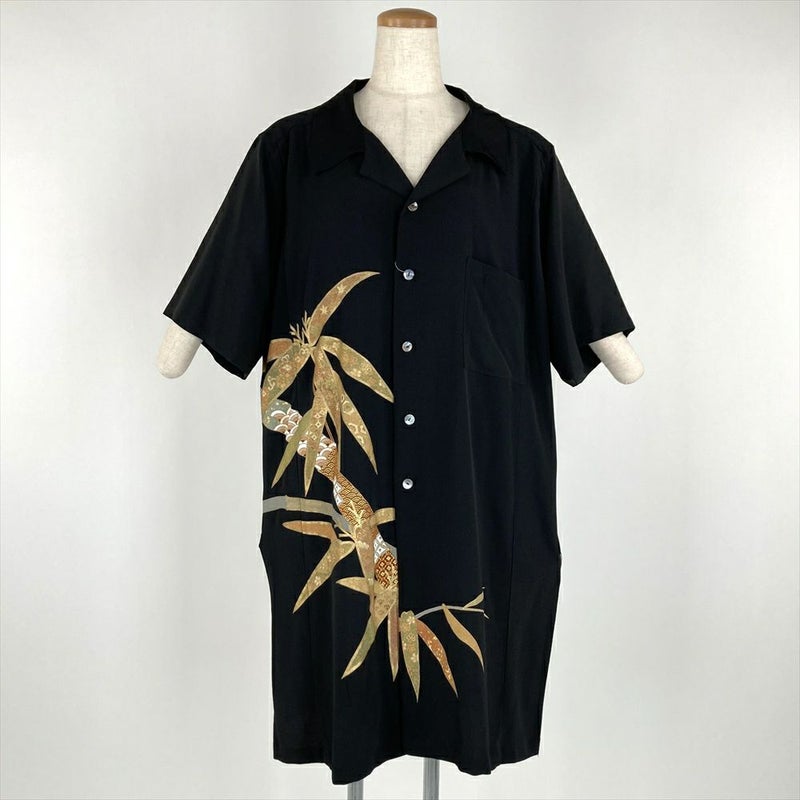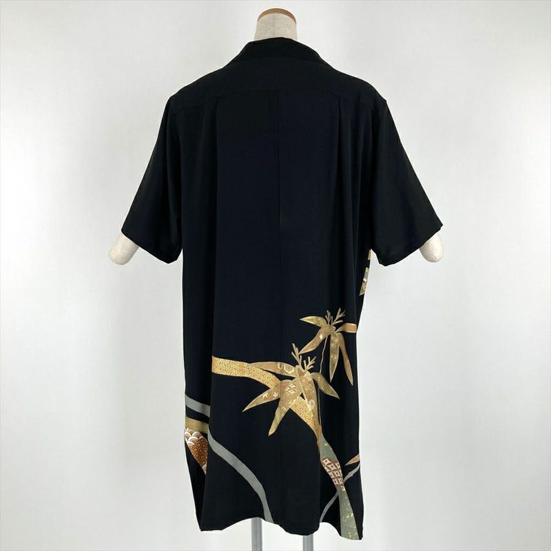 (リメイク) アロハシャツロングLL 黒色 カジュアル 刺繍 金彩 笹竹
