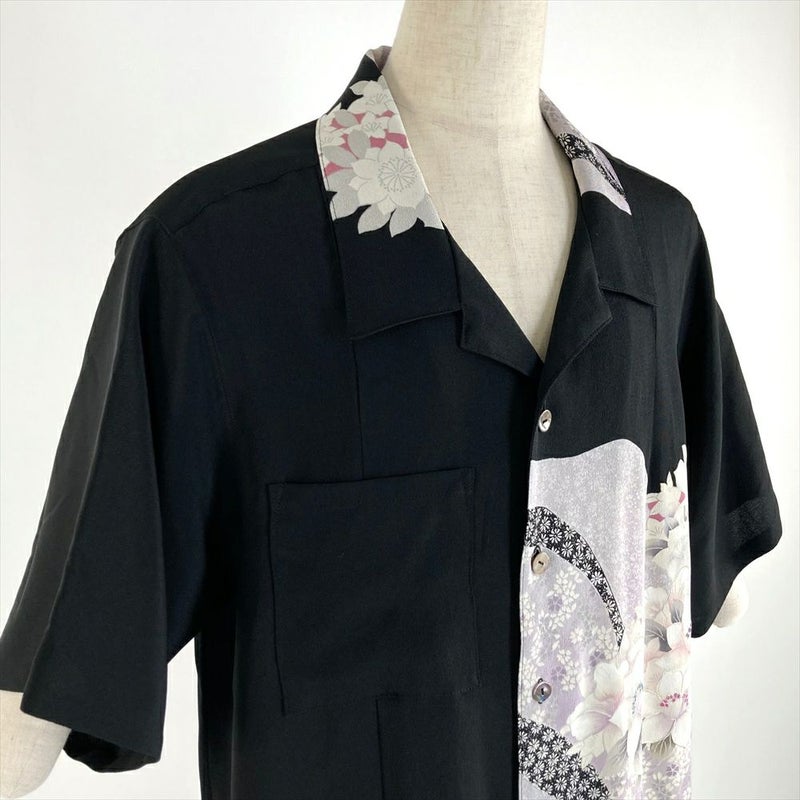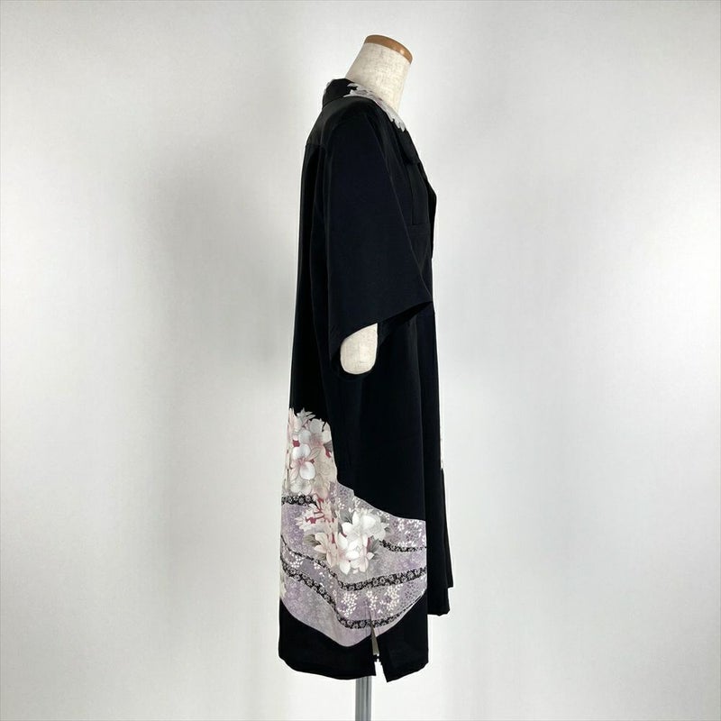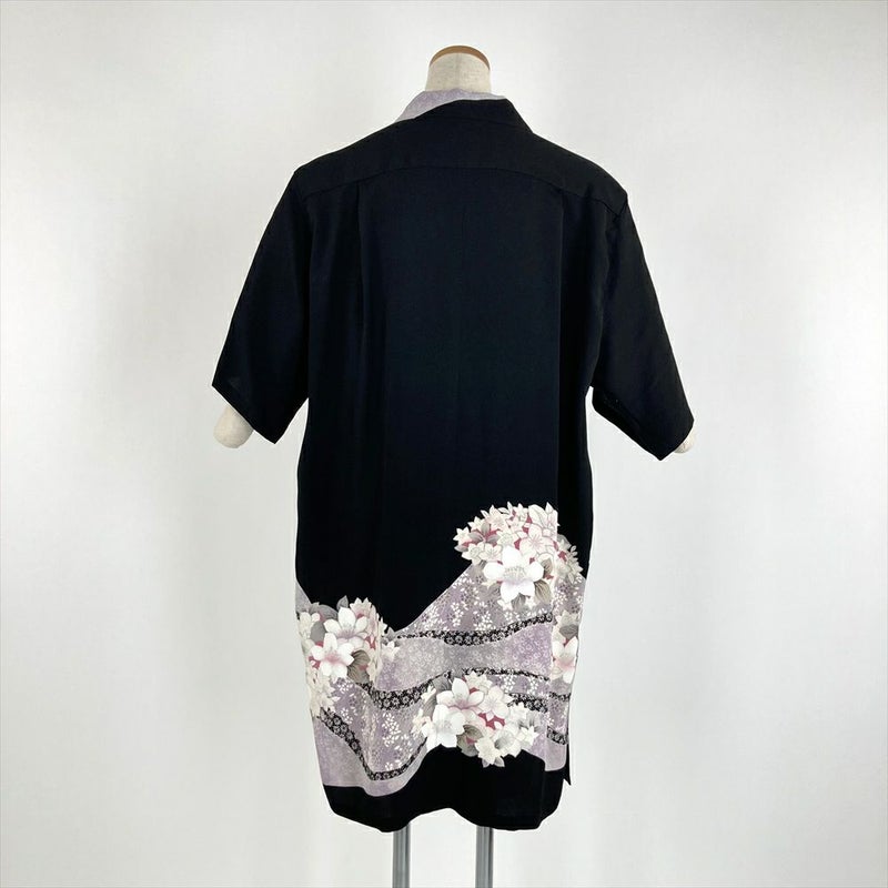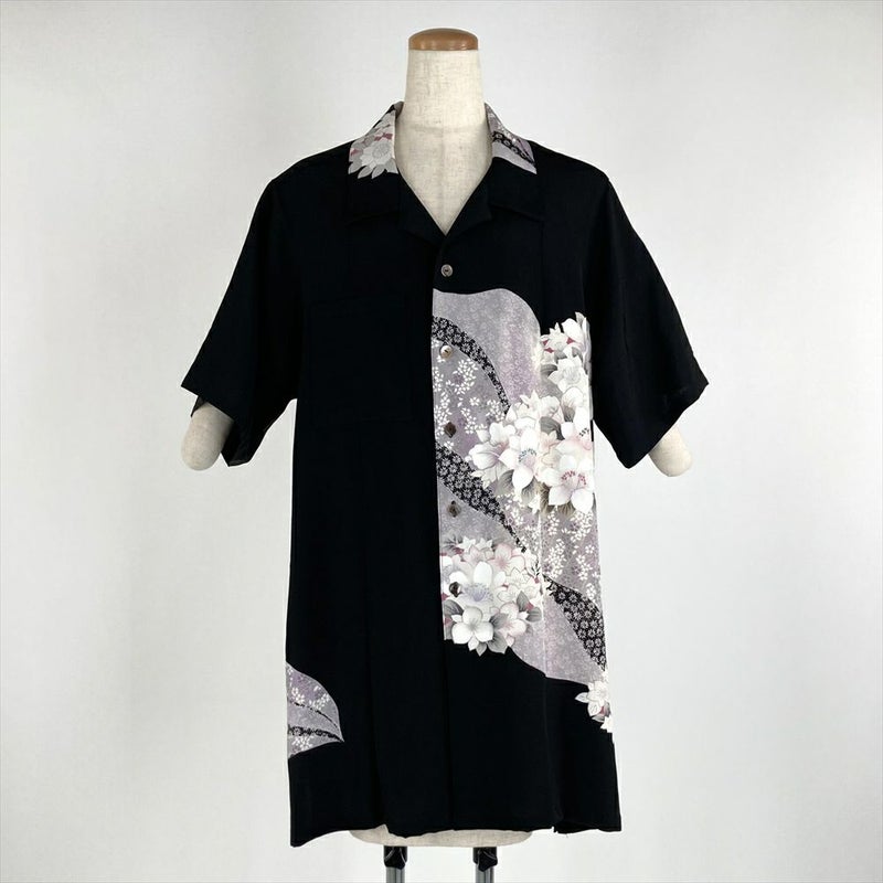 (リメイク) アロハシャツロングLL 黒色 カジュアル 刺繍 道長取り 四季花