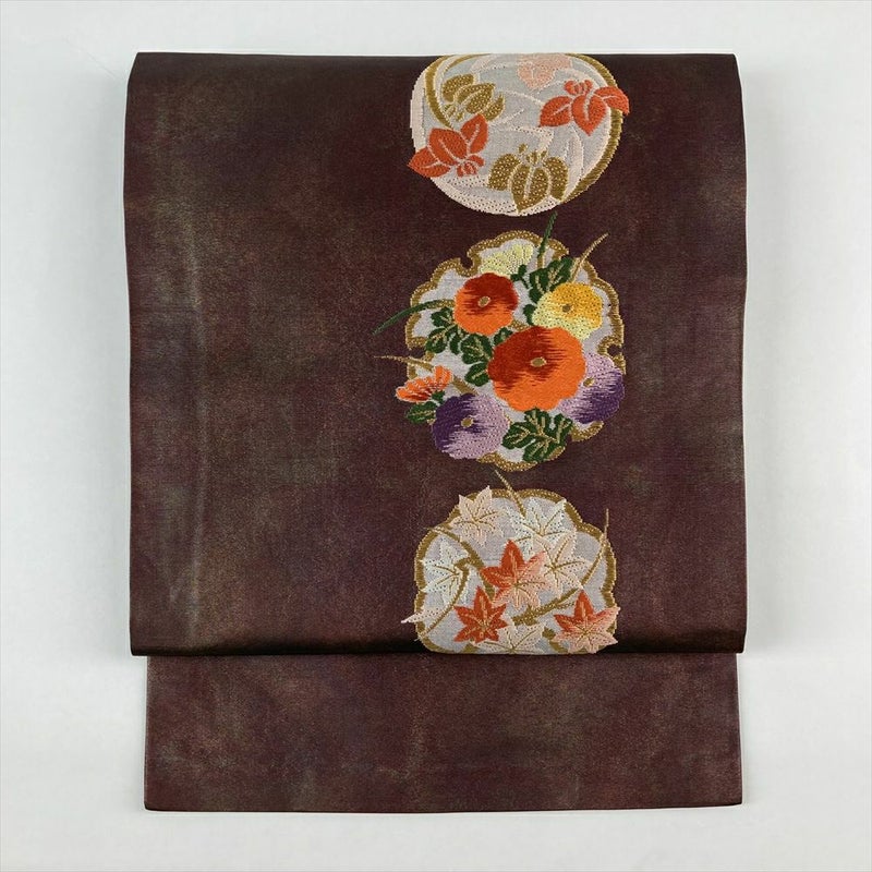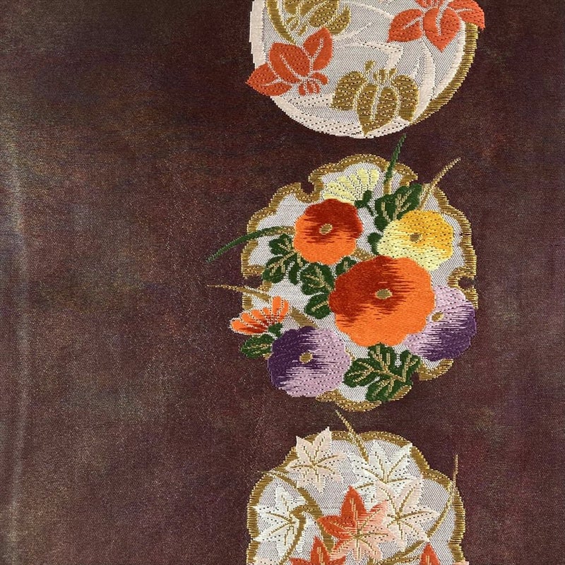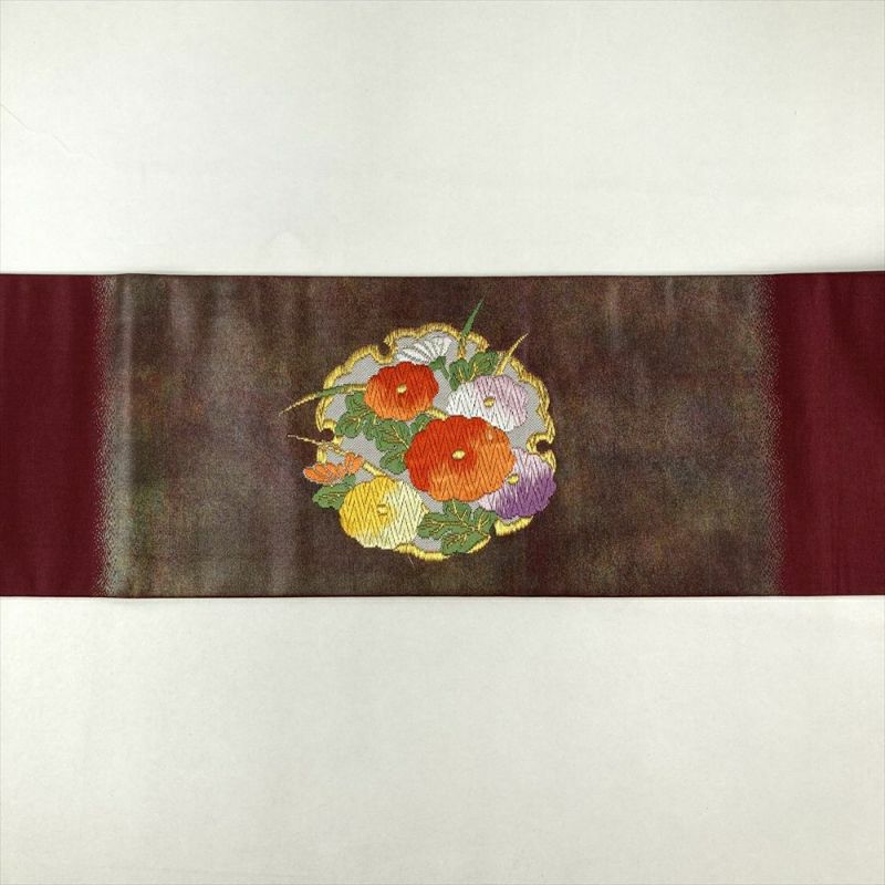 【色柄】赤紫 臙脂色 カジュアル 雪輪に四季花 引き箔 金糸 色糸