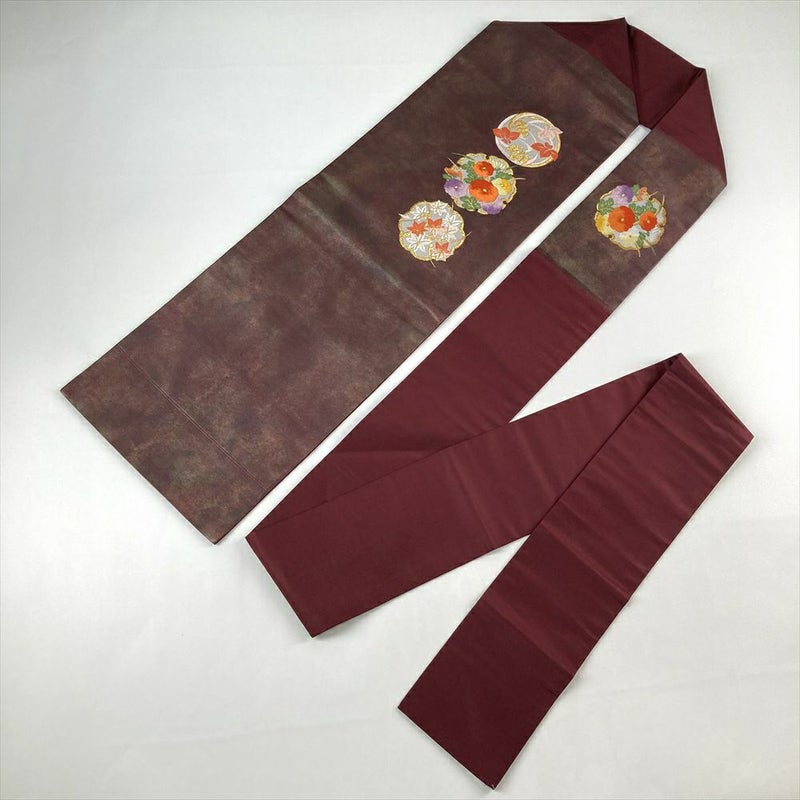臙脂色は、深みのある赤みがかった色で、華やかさと落ち着きを兼ね備えています。着物全体を引き立て、品格のある印象を与えます。雪輪に四季花は、日本の伝統的な着物や工芸品によく見られる美しい文様です。上品さ、そして汎用性を兼ね備えていますので、様々な着物とコーディネートを楽しむことができ、特別な日の装いをさらに華やかに彩ります。保存臭がややございます。