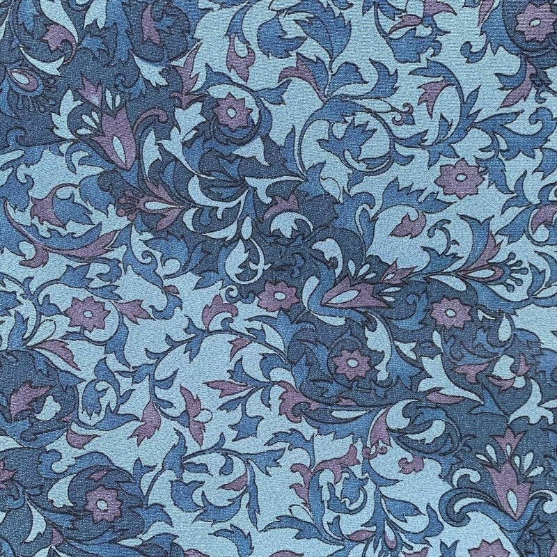鮮やかな青地に同系色の唐花がオリエンタル調でデザインされた総柄小紋です。
