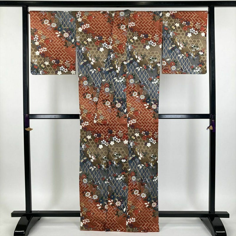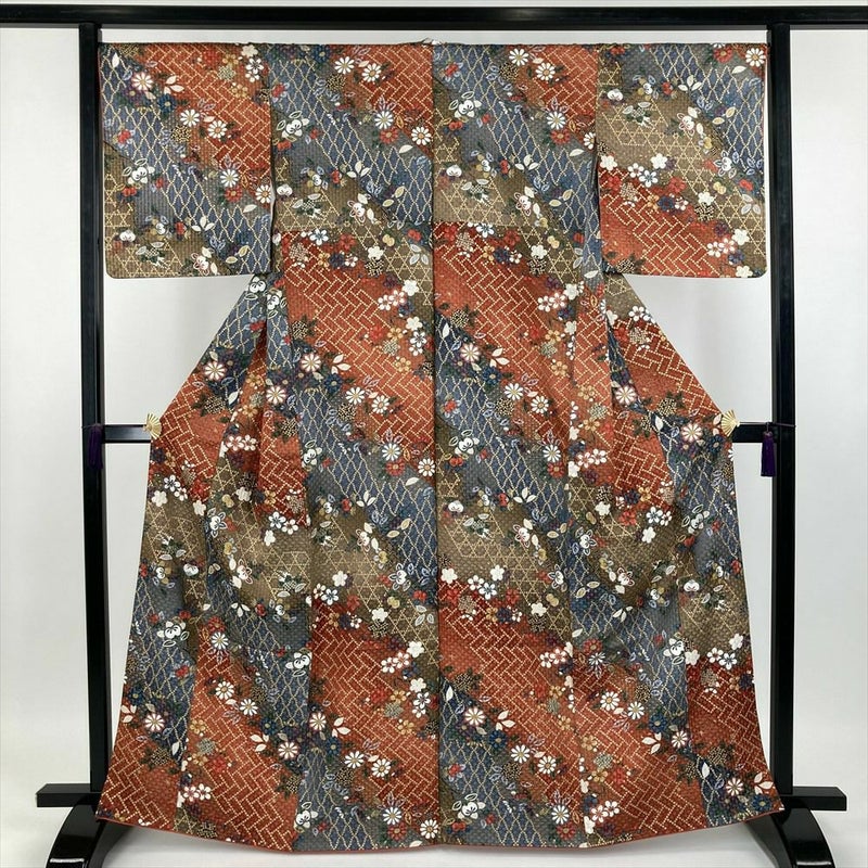 【セット⑭】(中古)小紋&名古屋帯 赤 青 マルチカラー 金 カジュアル【身丈】161cm【裄丈】68.5cm