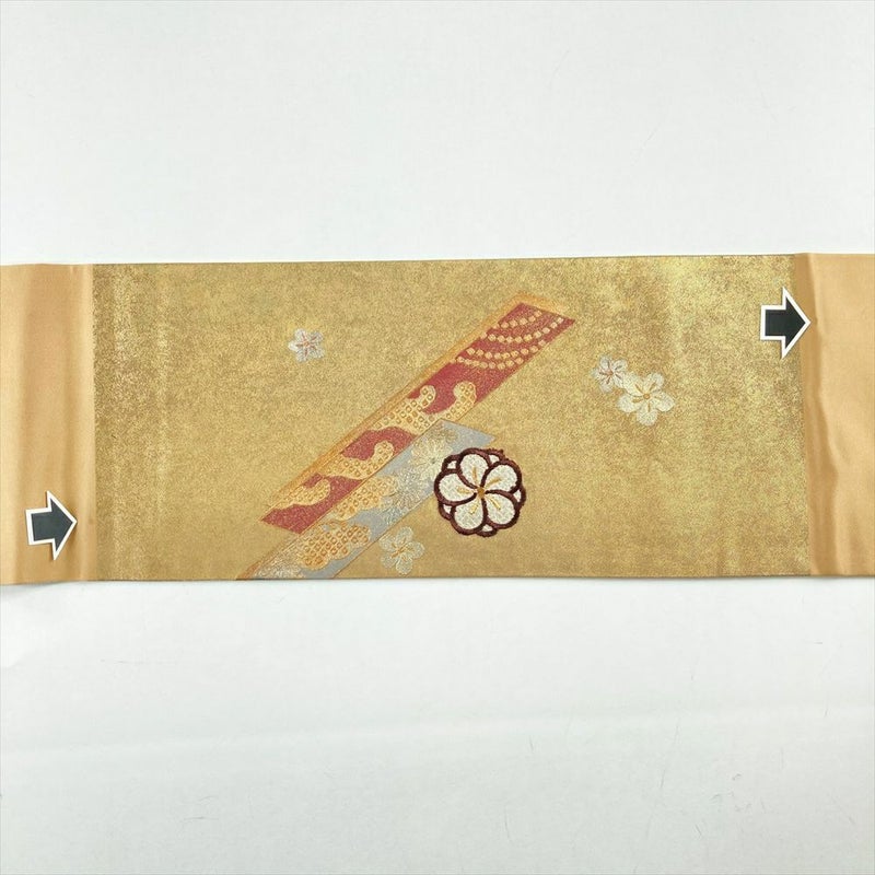七宝柄の地紋が上品な光沢を放ち、金彩で縁取られた梅と橘が、華やかさを添えます。