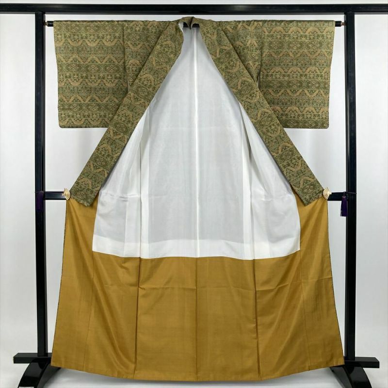 【セット㉘】(中古)紬&名古屋帯 黄緑 カーキ色 黄色 芥子色 カジュアル【身丈】159cm【裄丈】64cm
