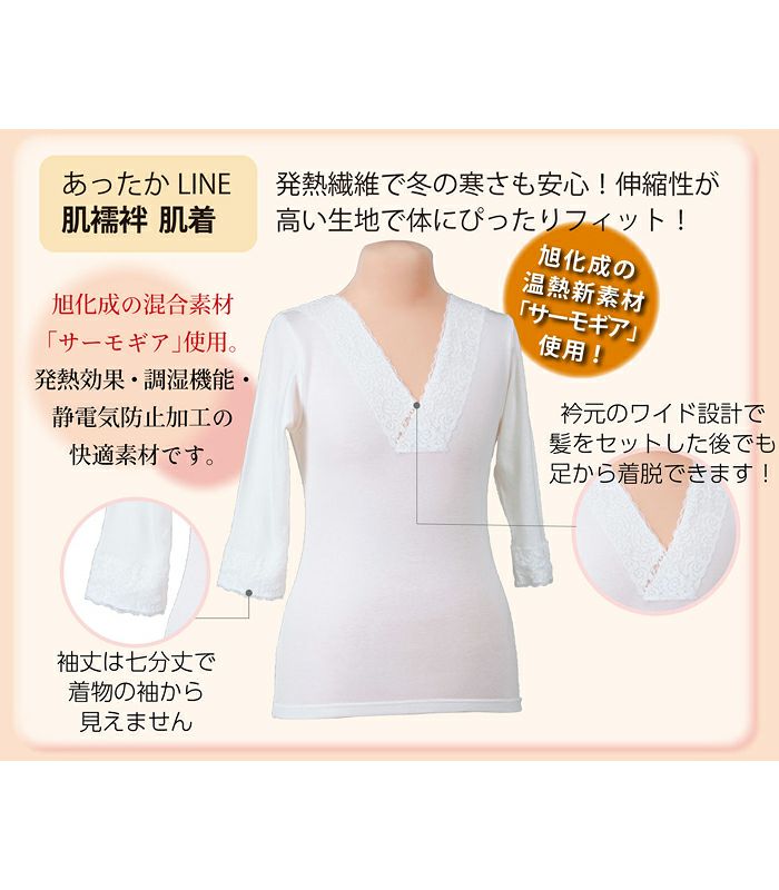 他の画像を見る あったかLINE 肌襦袢(M・L)都粋 ¥ 6,380 税込 あったかLINE 肌襦袢(M・L) あったかLINE 肌襦袢 下着 インナー 肌着 冬 あったか 白 ホワイト 旭化成 サーモギア 発熱繊維 ベンベルグ 吸湿 発熱 調湿 防寒 保湿 袖レース 七分丈 お気に入りに登録する