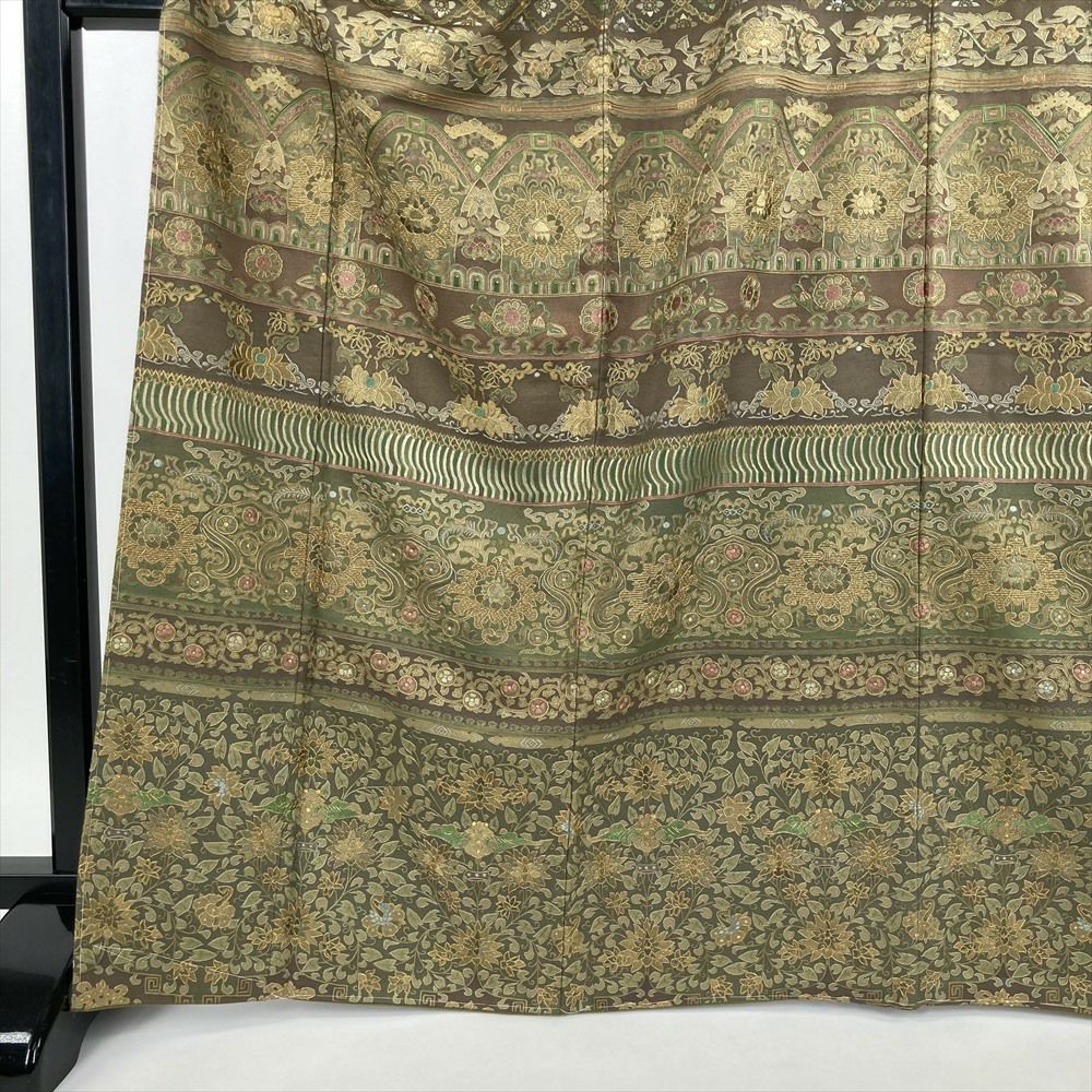 【色柄】鶸茶色 緑茶 フォーマル 染め 刺繍 金糸 花鳥 オリエンタル