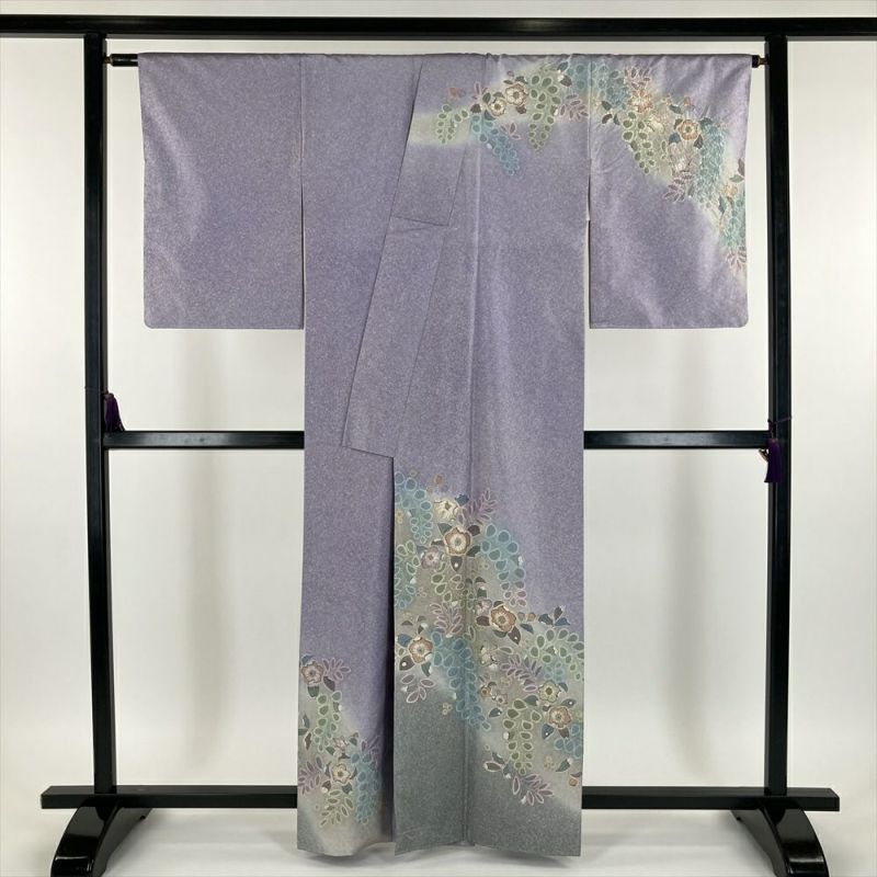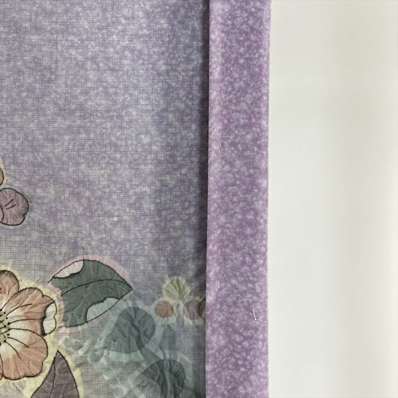 染め:藤紫色は、藤の花の色を思わせる、上品で美しい紫色です。明るい青みがかった紫色で、日本の伝統色の一つとして古くから愛されてきました。袖や裾には、柔らかな印象のぼかし染めが広がります。