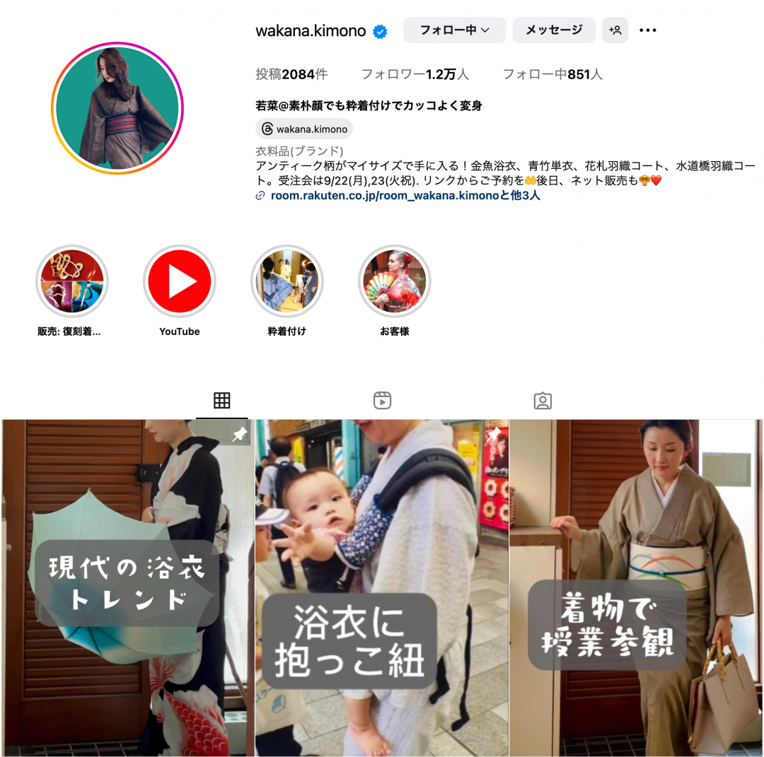 若菜さんは、素朴顔でも粋着付けでカッコよく変身」をテーマに、着物コーディネートや着付け、日常生活で着物を楽しむ様子を紹介されています。普段着物や復刻着物の使い方、写真撮影、ストーリー性ある投稿が多く、着物好きな人にはとても参考になりますよ!!