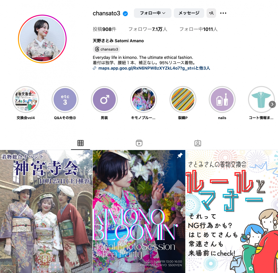 天野さとみさんはフォロワー約71,000人、着付けは独学、腰紐1本・補正なし・95%リユース着物というユニークなスタイルを持っているインフルエンサー。普段使いの着物コーデ・和洋ミックス、華やかな着物を日常着にアレンジする方法を積極的に紹介されています。