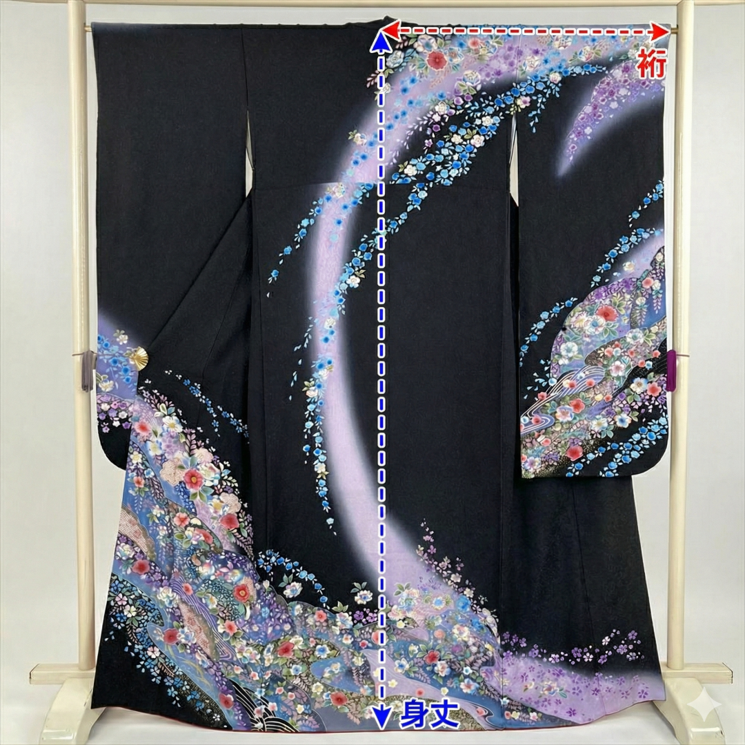 - 身丈(みたけ):着物の縦の長さで、身長に近い部分。長すぎるとおはしょり(ウエスト部分で調整する折り返し)で調整できますが、短すぎると美しく着られません。