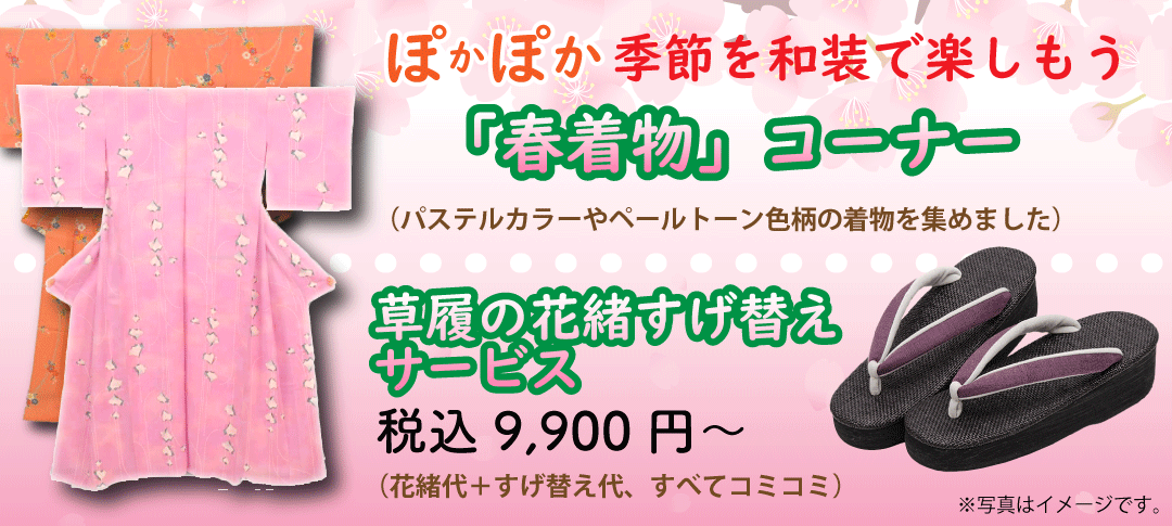 季節に敏感な皆様にとっては、そろそろ春を感じるシーズン。そこで新セールといたしまして、「春を待ちわびる"先駆け"セール」と題しまして単衣紬30%OFFをスタートさせていただきます。衣替えの準備にご利用ください。なお、引き続き「袷もの30%OFF」につきましては2月末まで延長いたしますので、ごゆっくりお選びください。