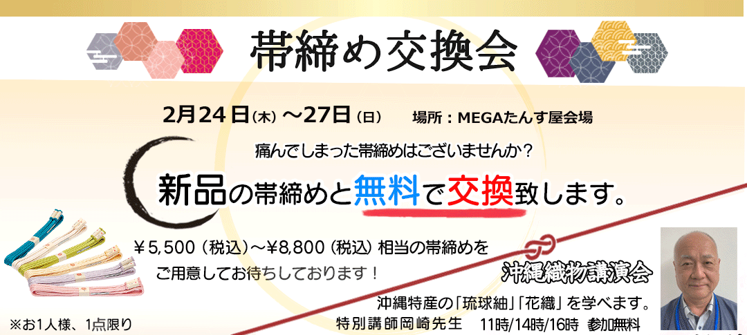 次回のウィークエンドイベントは「帯締め交換会」として、なんと、持参していただいた帯締めを新品と交換させていただきます。得以外ありませんよ! 詳しくは下記をご覧ください!