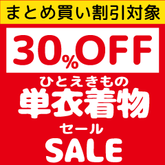 現在、まとめ買いするほどに割引率が上がる「春のフォーマルキャンペーン」を開催中ですが、今週から対象品として「単衣着物(紬以外)」と「九寸名古屋帯」が追加されます。このうち単衣着物はすでに30%OFFになっていますが、これも「まとめ買い」の対象となります。したがって、定価10,000円の単衣着物でしたら、現在30%OFFで7,000円ですが、さらに「まとめ買い」を最大利用(50%OFF)することで、3,500円での購入が可能となります。激ヤバゾーンに突入です!