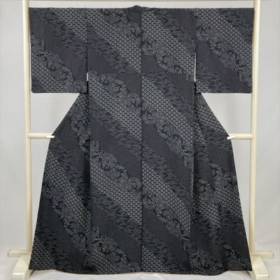 (中古) 小紋 黒 カジュアル 縮緬 斜め取り 松 梅 霰 袷 絹 【身丈】157.5cm【裄丈】70cmのレビュー