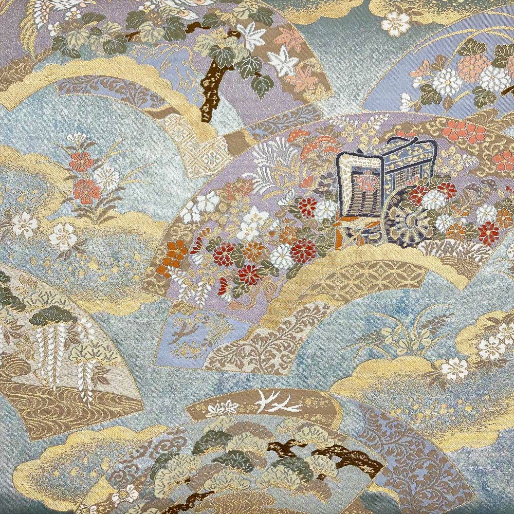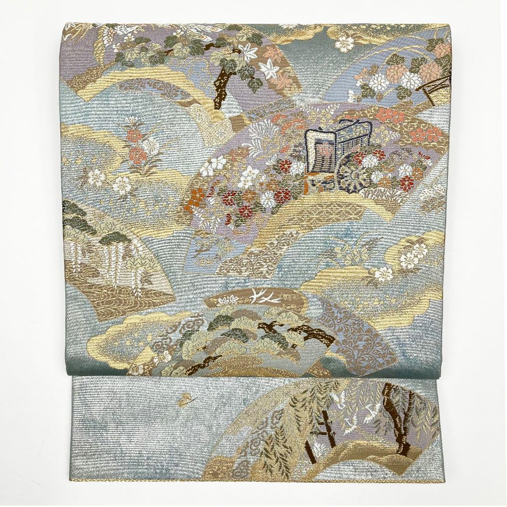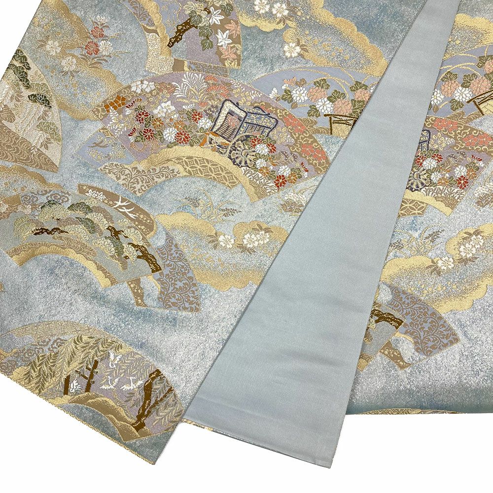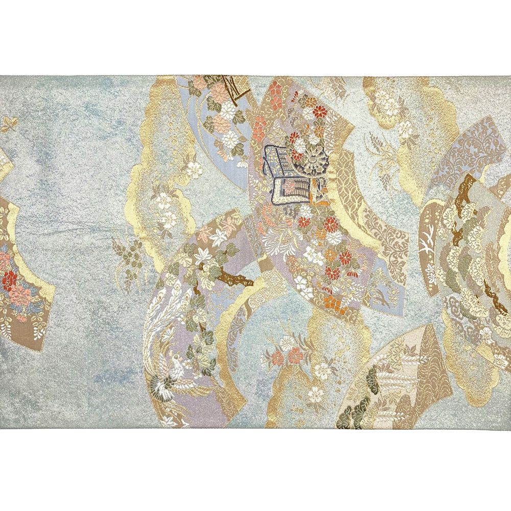他の画像を見る (中古)袋帯 薄水色 金 銀 フォーマル セミフォーマル 六通 引箔 扇面取り 花鳥 御所車 雲 「瑞宝の匠」 通常価格 ¥ 16,500 のところ ¥ 11,550 税込 お気に入りに登録する