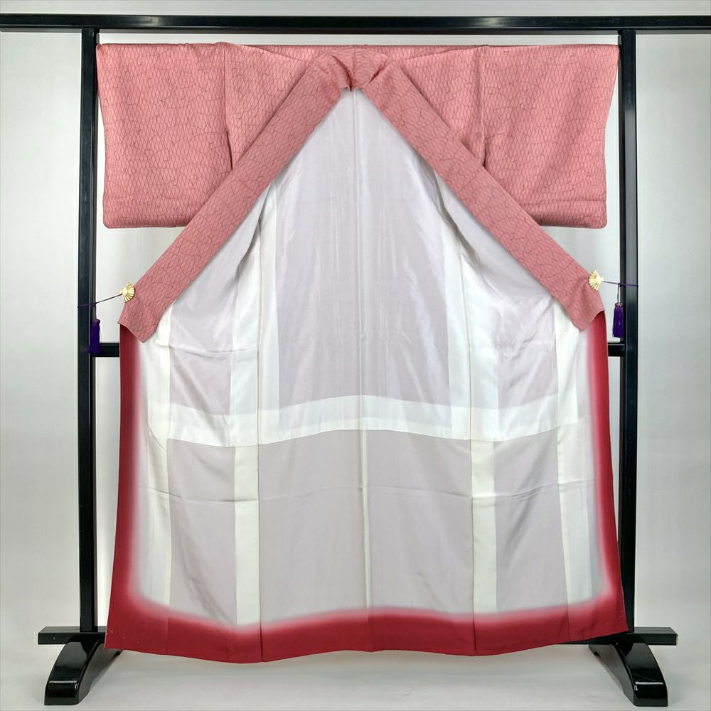 他の画像を見る (中古)小紋 ピンク ベージュ カジュアル ちりめん ぼかし染め 金彩 鳥 四季花 袷 未洗い S【身丈】158cm 【裄丈】67cm 未洗い ¥ 2,750 税込 お気に入りに登録する