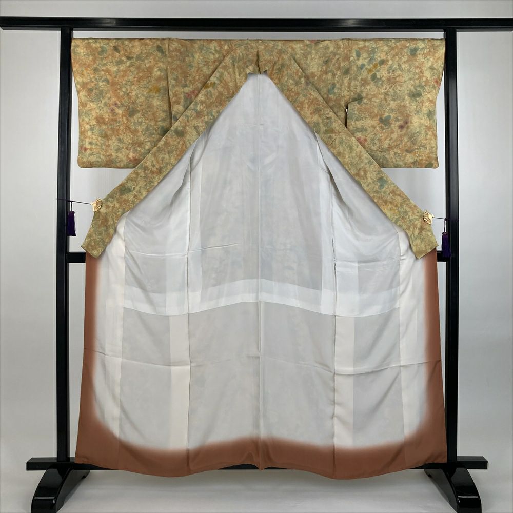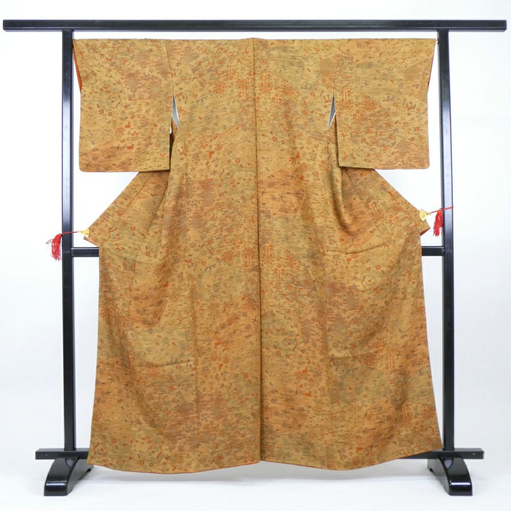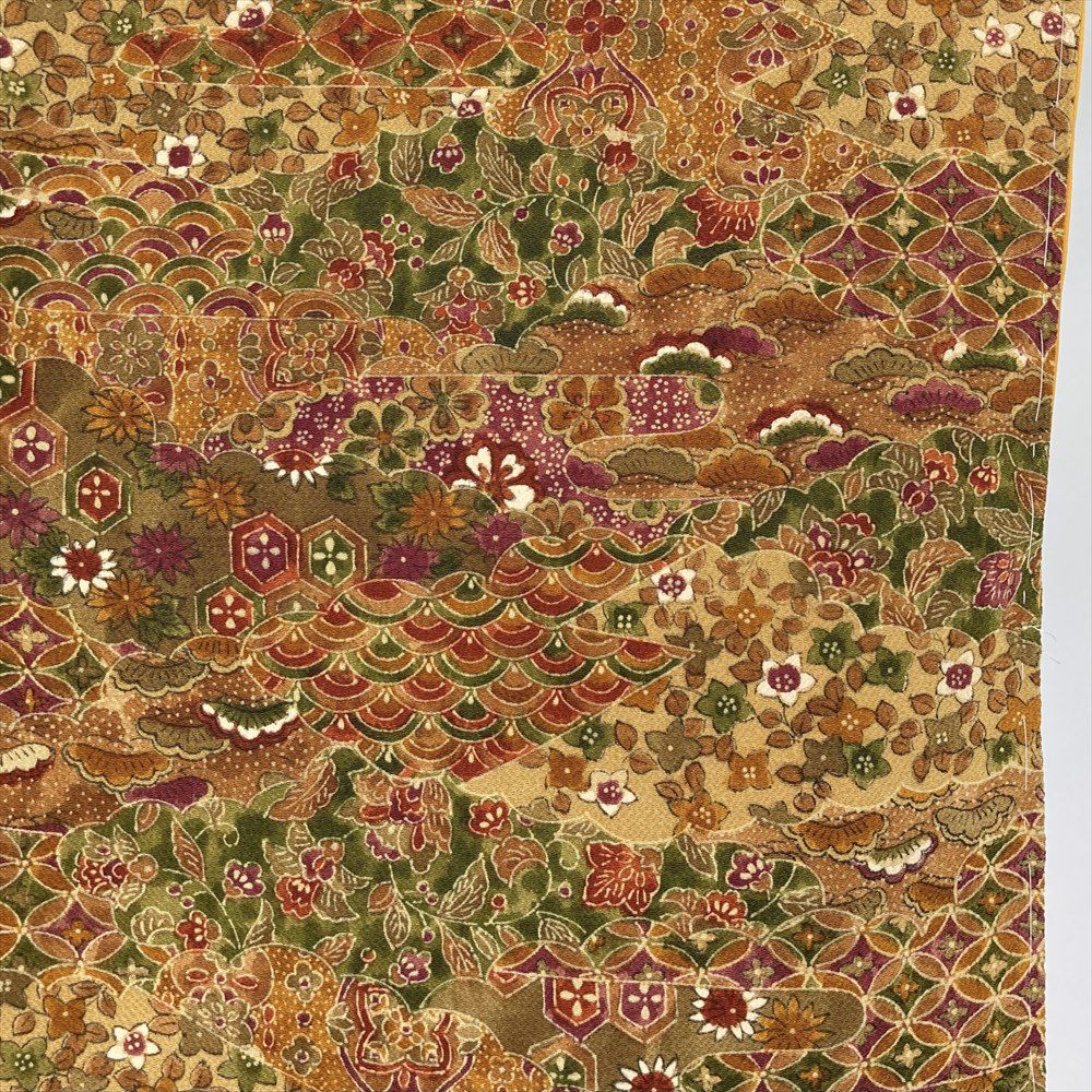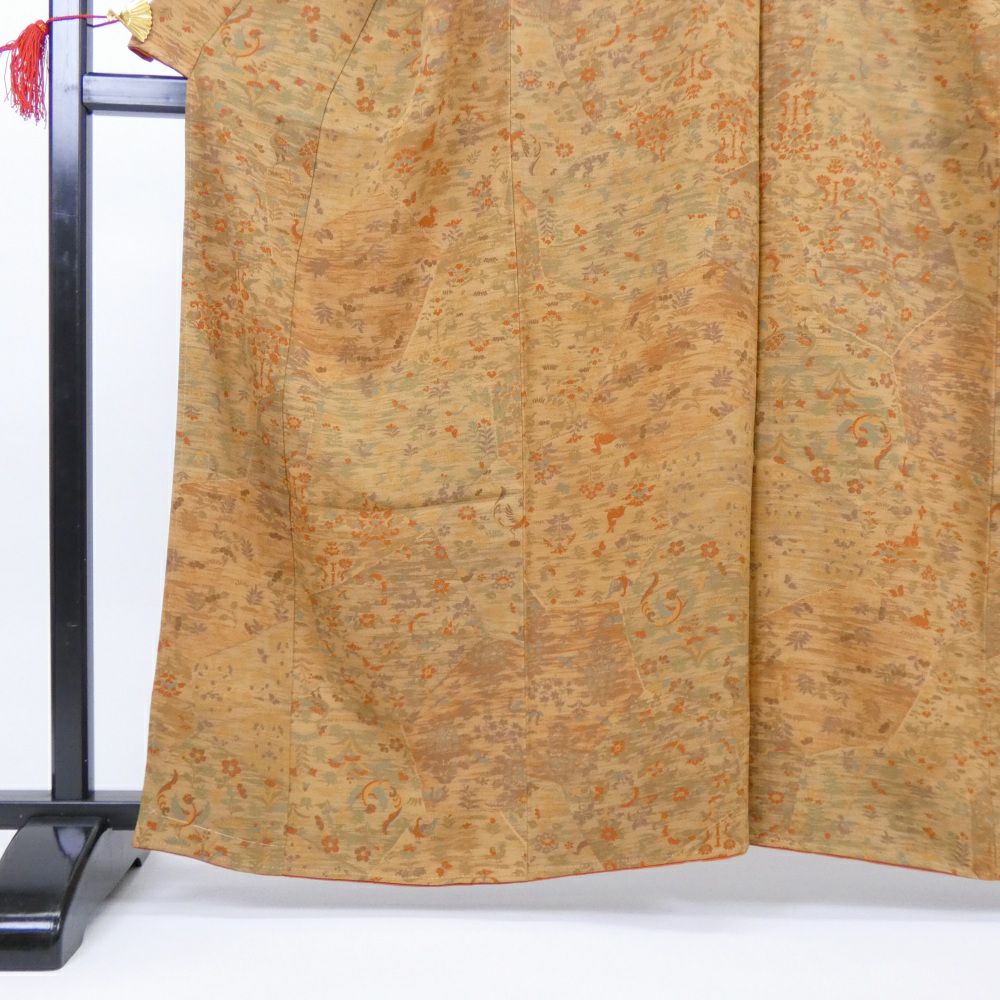 他の画像を見る (中古)小紋 ベージュ 黄色 緑 カジュアル ちりめん 染め 唐花唐草 吉祥文 オリエンタル 袷 SS【身丈】153cm【裄丈】66.5cm ¥ 16,500 税込 お気に入りに登録する