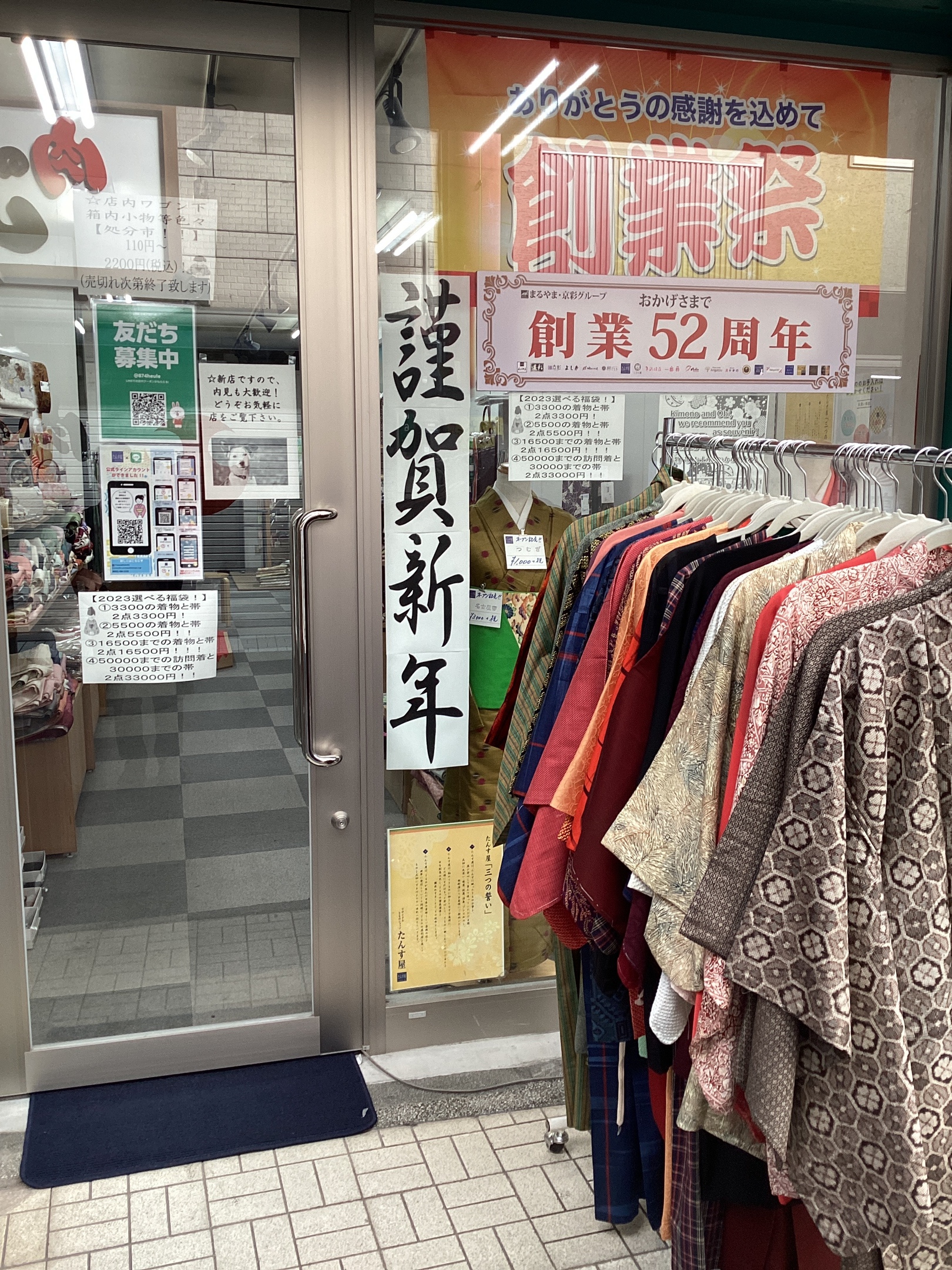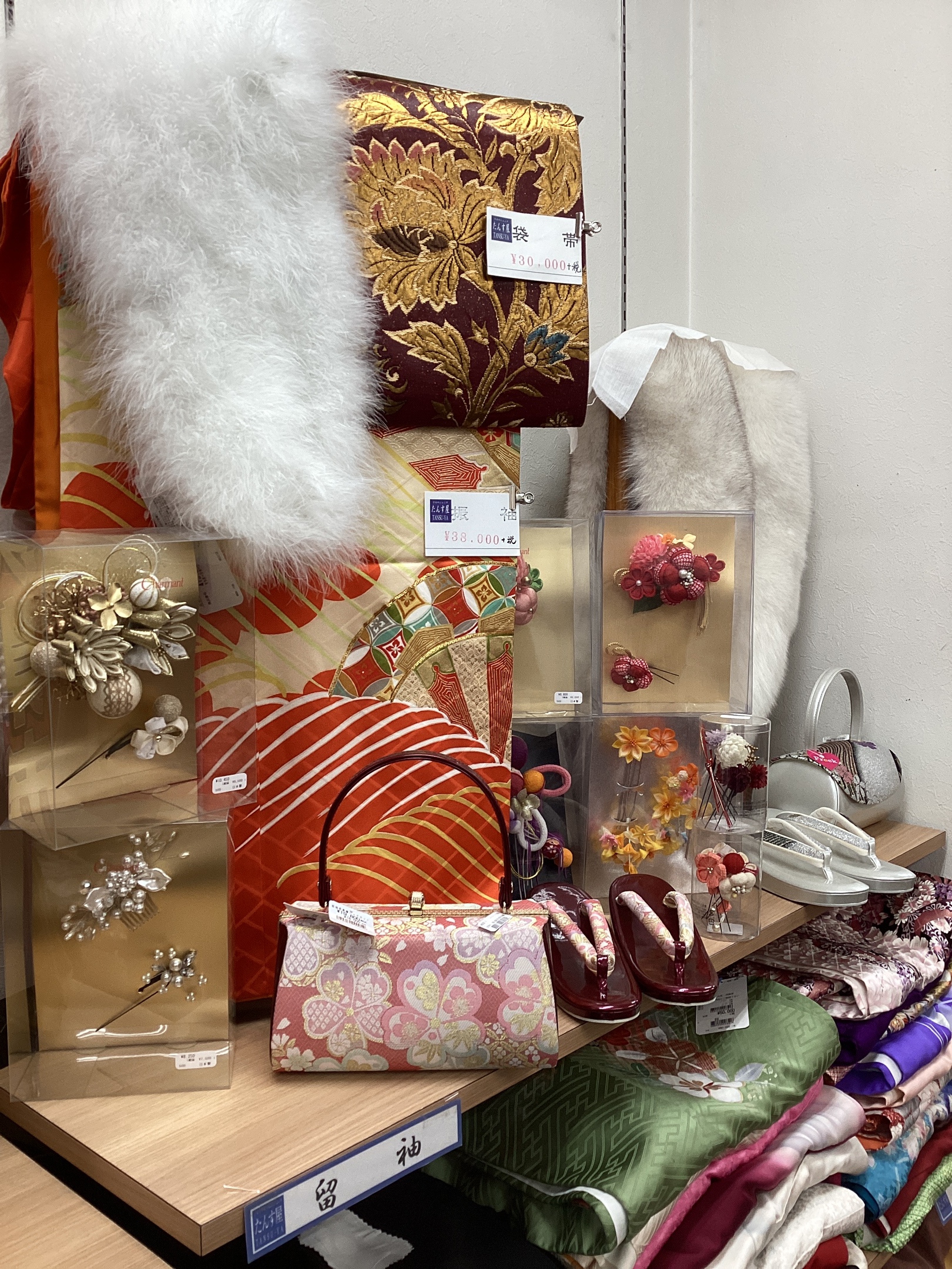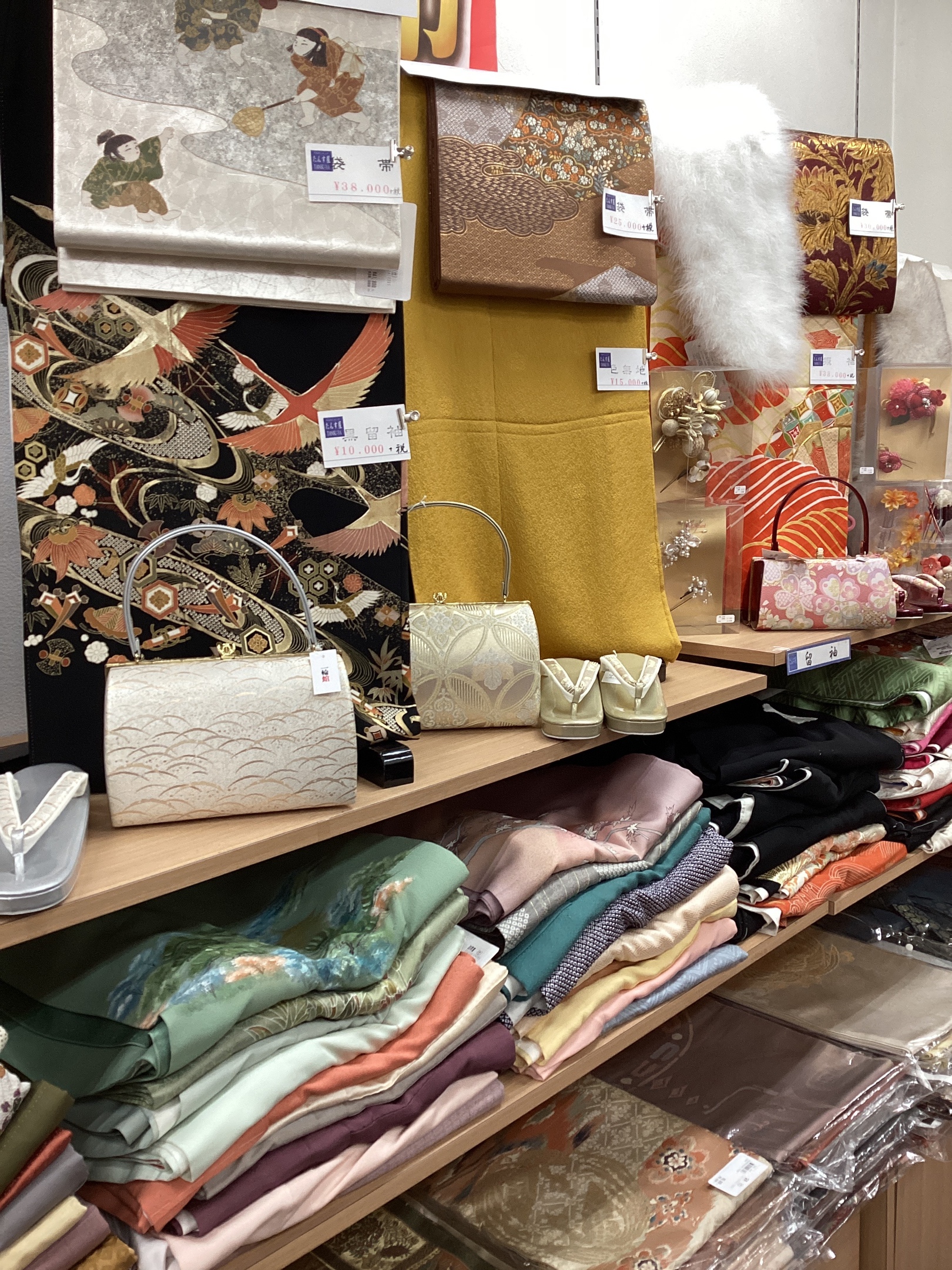 呉服店様のように、入りにくい、敷居が高い、という言葉は全く当店にはあてはまりません!(^。^) とにかく入りやすい、着物、帯、小物、その他いろいろを触りやすい、試着しやすい、という本当にお気軽に、散策と観光ができるお店です(^。^)