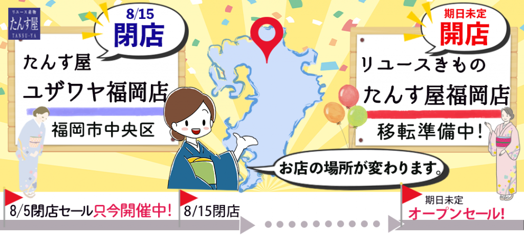 リユース、新品のカジュアル、フォーマルの着物、帯を中心に、福岡に開店して10年目になります。着物や帯だけでなく、リユースたんす屋の真骨頂でありますリユースの小物も、なんと100円からございます!
