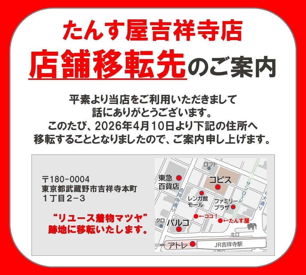 直営店現たんす屋吉祥寺駅前店は2026/3/31(火)で閉店し、移転先にて2026/4/10(金)オープンとなります。
